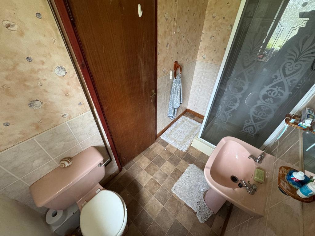 With enclosed corner shower, w.c. single wash hand basin, part tiled walls, vinyl flooring.