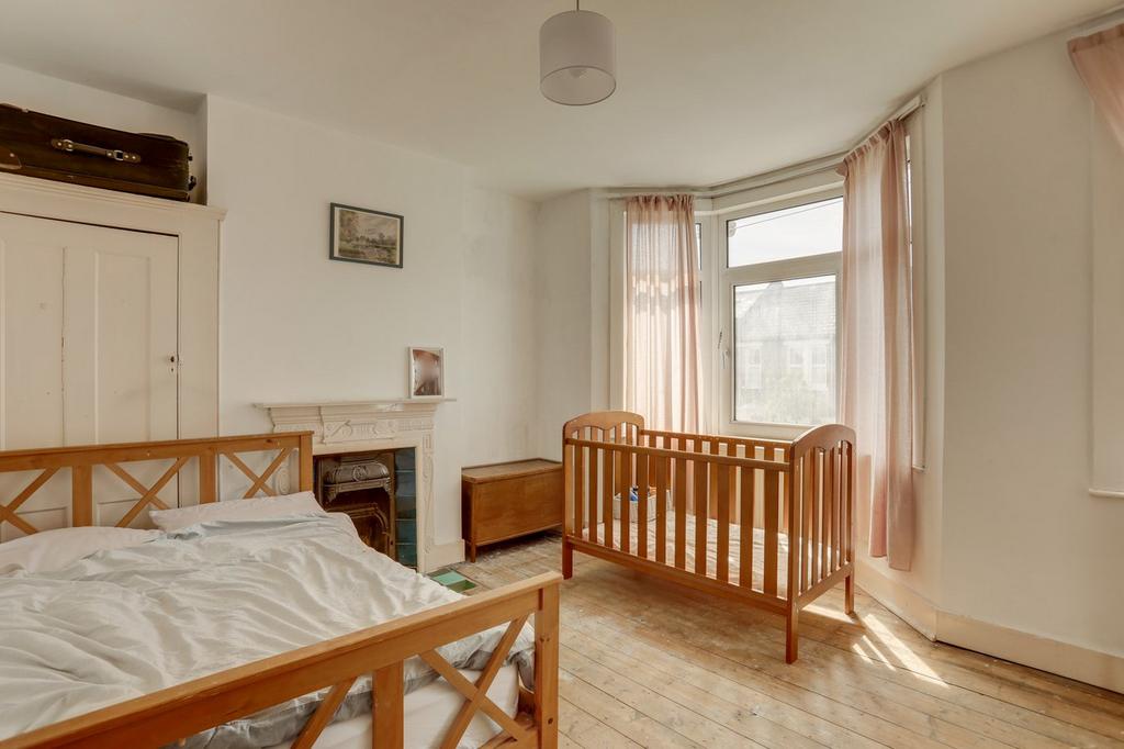 Double-glazed bay windows, ceiling light, fireplace, radiator, wood flooring.