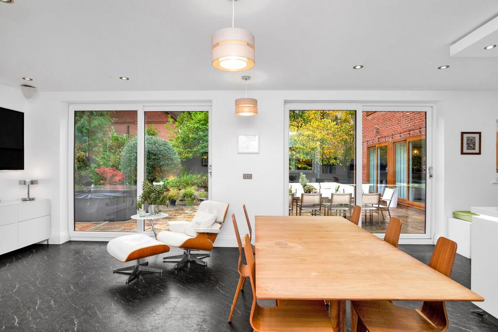 The 288m2 sunken football pitch, trampoline and detached summerhouse (the biggest you can build without planning permission and fully internet connected) create separate zones for kids, adults and everyone in between. Newly seeded lawns front and back keep it all looking perfectly manicured.
