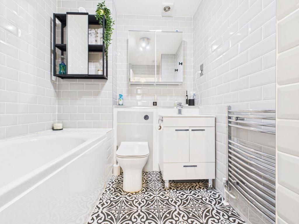 FAMILY BATHROOM A sleek and contemporary bathroom suite comprising a panelled bath with shower attachments, low level flush WC, vanity wash hand basin with storage below, chrome heated towel rail, modern tiling and an extractor fan.