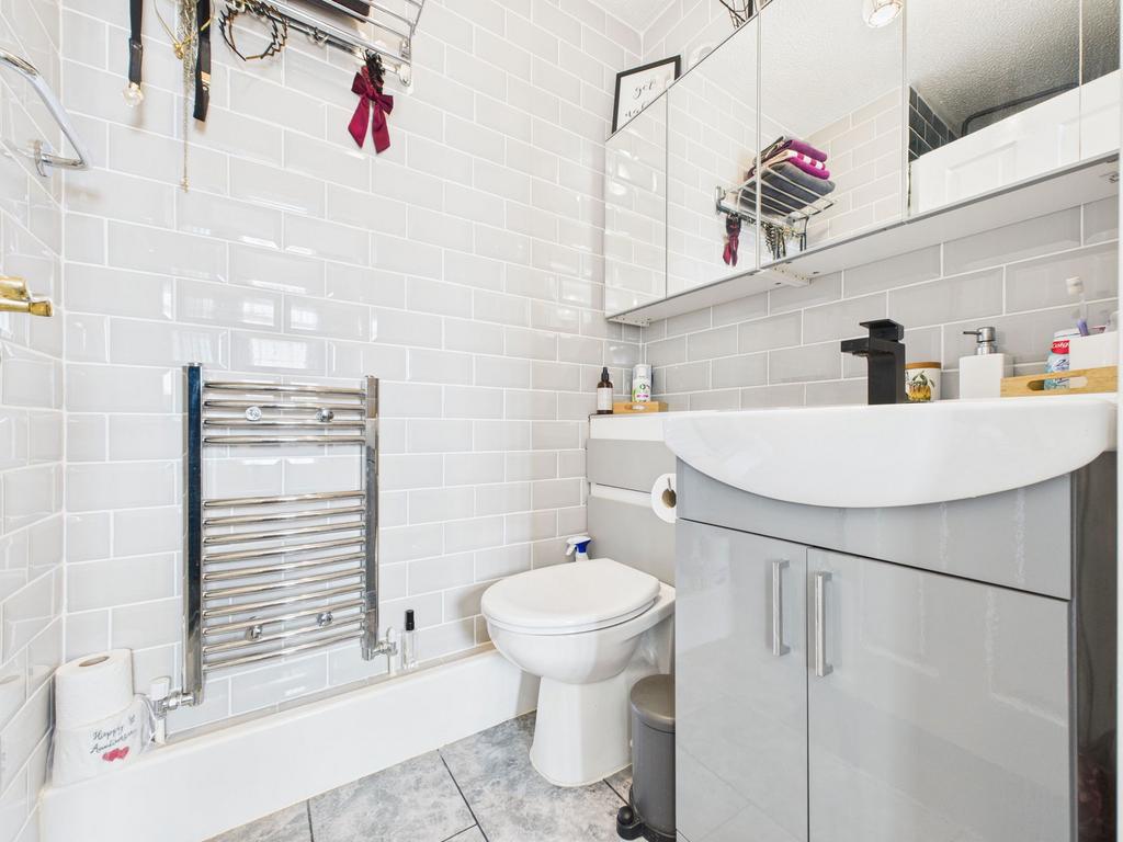 CLOAKROOM A stylish and practical downstairs cloakroom comprising a low level flush WC, wall mounted wash hand basin with integrated storage, a gas central heated radiator and an obscure uPVC double glazed window.