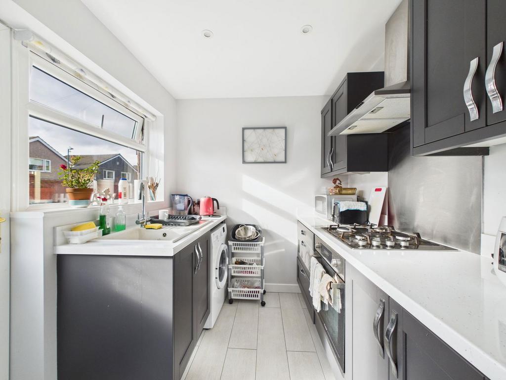 The modern kitchen is both stylish and practical, fitted with grey wall and base units, white worktops, and a range of appliances including an oven, gas hob with extractor fan, sink, and washing machine. There’s also space for a freestanding fridge freezer and additional countertop appliances. A rear door leads directly into the garden, adding convenience and easy access for outdoor dining or gardening.