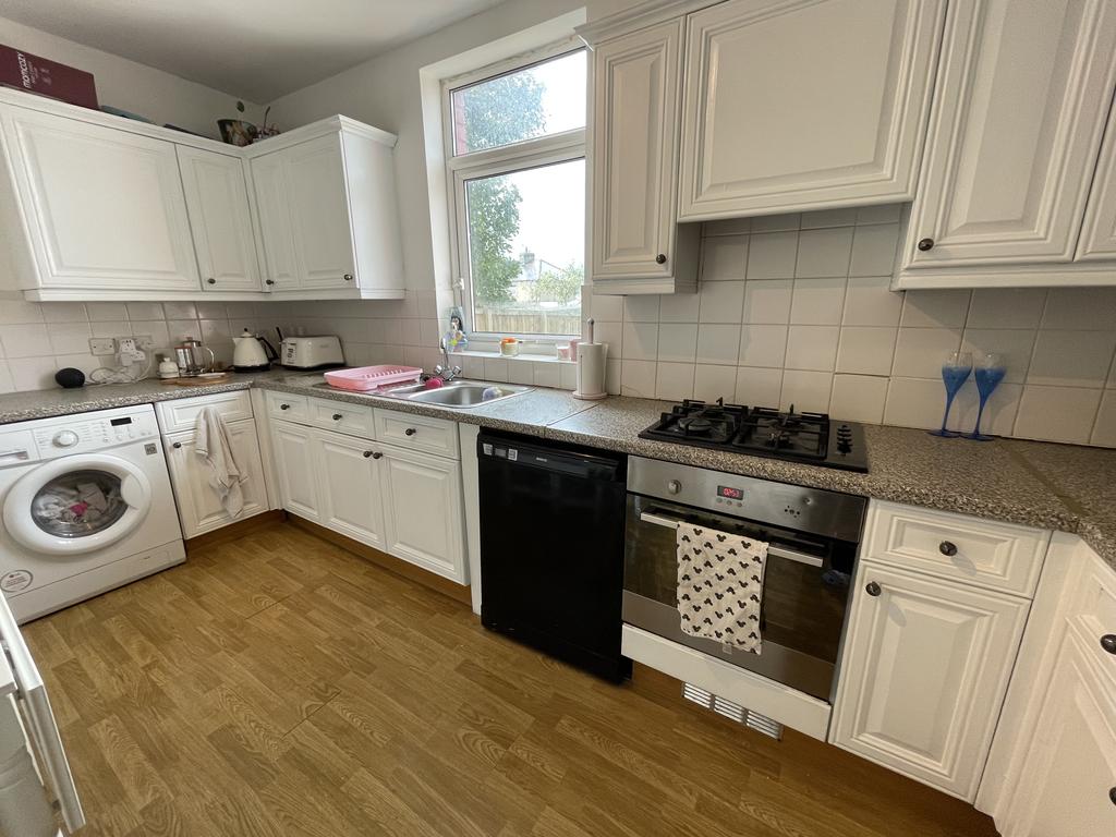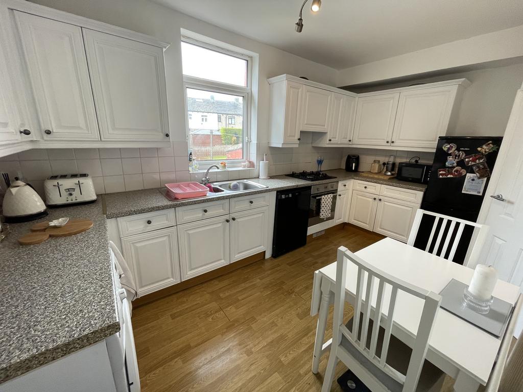 Dining Kitchen (14'3 x 8'5) Fitted base and wall units, sink unit and worktops, plumbing for washing machine, central heating radiator, double glazed window and under stairs storage cupboard.