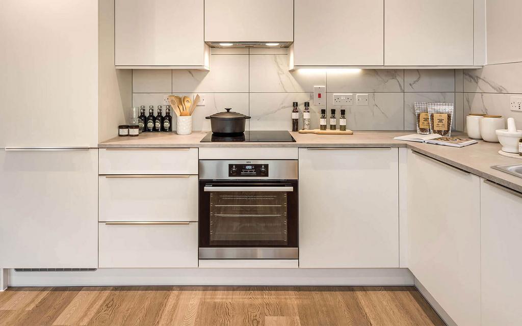 - Integrated oven, induction hob, fridge/freezer & dishwasher