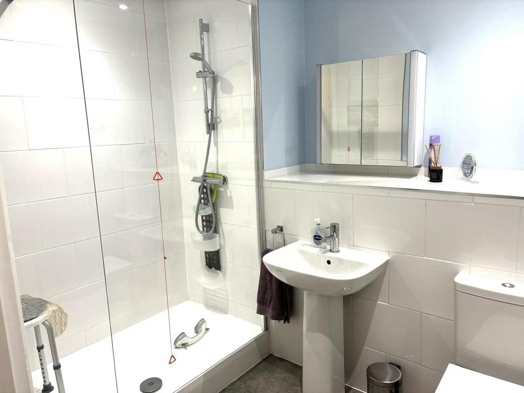 A recently installed shower room with large partially tiled shower with wall mounted shower unit. A white suite comprising a wash hand basin with mixer taps and low level WC. Heated towel and partially tiled walls.