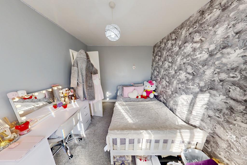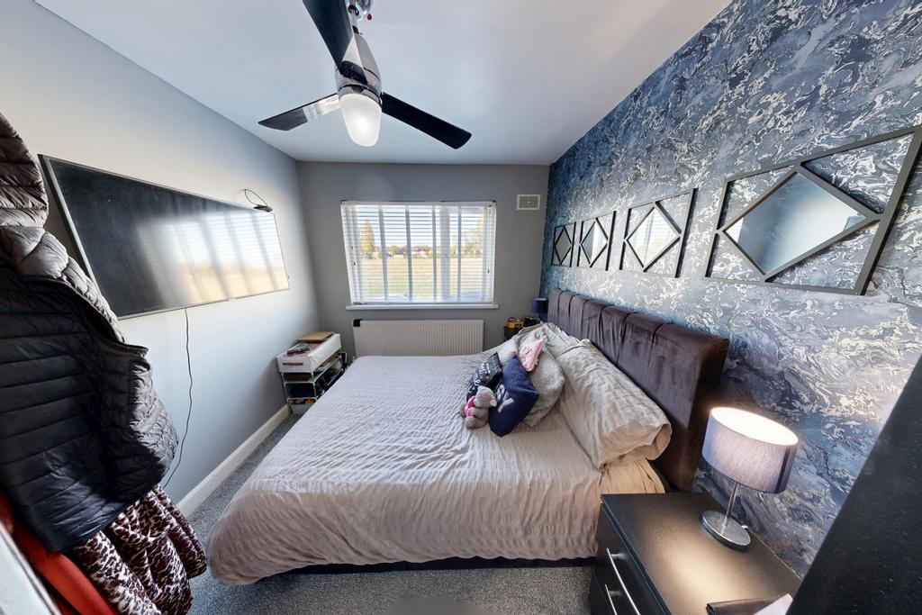 A well-presented bedroom featuring grey-painted walls complemented by a stylish feature wallpapered wall, creating a modern and calming space. The room is carpeted throughout for added comfort and benefits from a double-glazed window overlooking the rear garden, providing pleasant views and plenty of natural light.