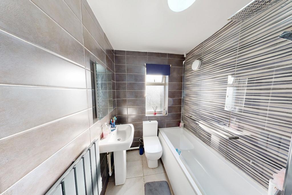 A modern and well-presented family bathroom, fully tiled to the ceiling for a contemporary finish. The suite comprises a bathtub with overhead shower, mixer tap, and fitted glass screen, wash basin, and WC. A double-glazed frosted window provides both privacy and natural light, while central heating ensures a comfortable and inviting space throughout the year.