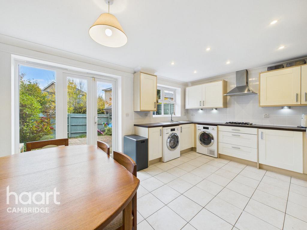 Positioned to the rear of the property, the kitchen/diner is fitted with wall and base units, integrated appliances include stainless steel sink, four-ring gas hob with extractor over, fitted oven, full length fridge/freezer and room for washing machine, dryer and dishwasher. The space is complemented by spotlights to ceiling and tiled flooring. The adjoining dining area comfortable accommodates furnishing with double glazed French doors out to the garden.