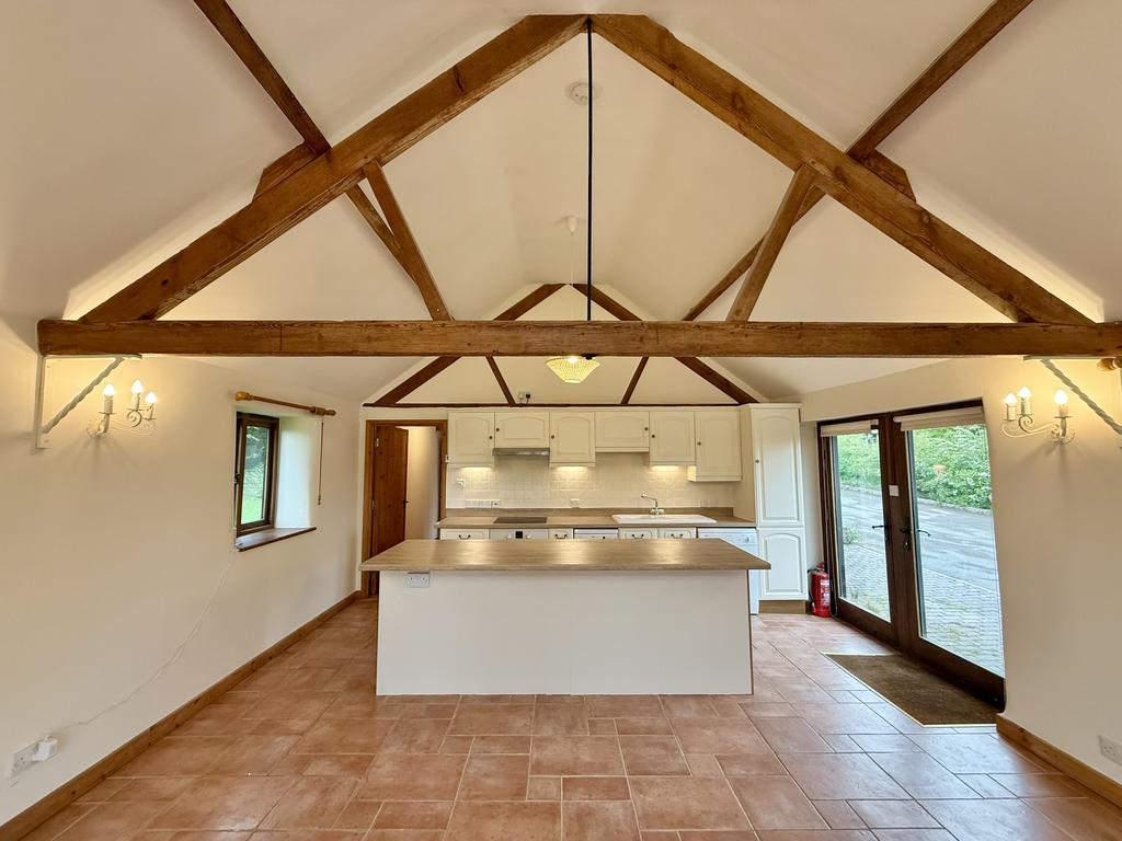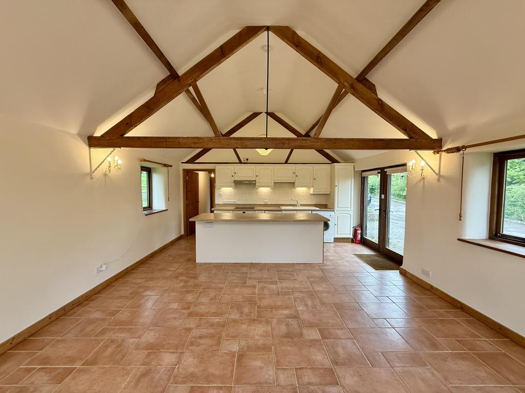Spacious open-plan room featuring a newly fitted kitchen with a range of floor and wall-mounted units, complemented by sleek work surfaces. Includes an integrated single door oven with hob and extractor fan above, along with a freestanding slimline dishwasher and washing machine. A white porcelain sink with drainer. A central island offers additional storage and creates a natural divide between the kitchen and the living area. The living space benefits from double-glazed windows at both the front and rear, as well as double French doors that open onto a rear terrace, showcasing stunning countryside views. The room is finished with tiled flooring throughout, underfloor heating, and a striking vaulted double-height ceiling with exposed beams.