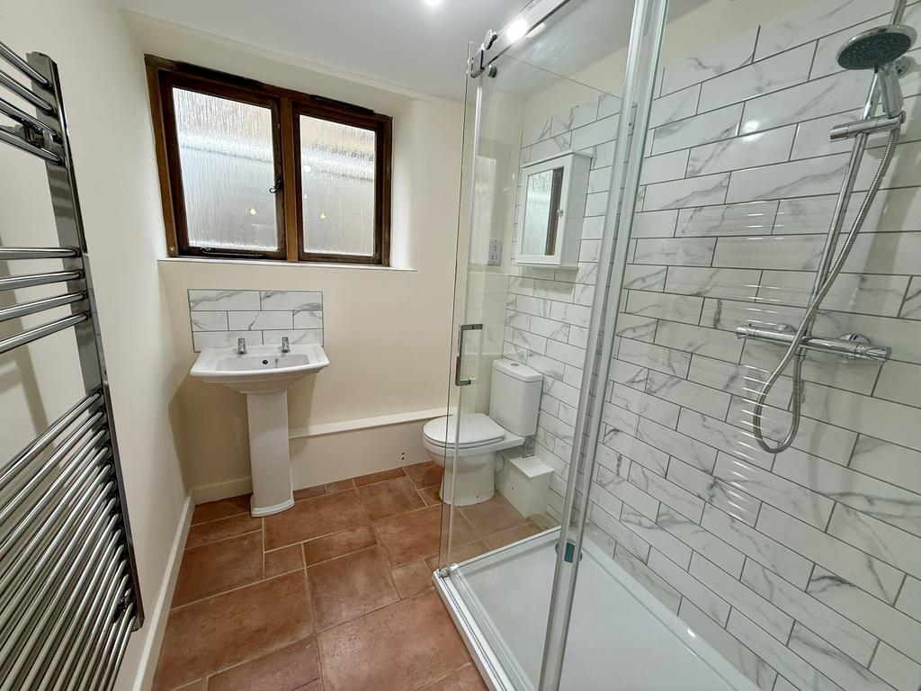 Recently installed suite featuring a spacious walk-in shower cubicle with a mains powered shower, close-coupled WC, and a pedestal wash hand basin. Additional features include a chrome heated towel rail, double-glazed window to the side aspect, and a tiled floor with underfloor heating