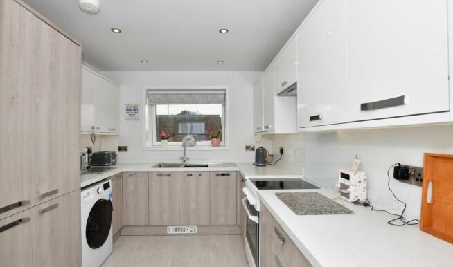 Kitchen - 13' 1" x 10' 5" (3.99m x 3.17m) Matching wall and base units with complementary work surfaces over, splash backs, one and a half bowl sink and drainer unit, electric hob and oven, wine fridge, integral fridge freezer, window to rear.