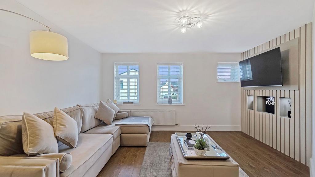 Step into a generous entrance hallway that sets the tone for the rest of the home—tastefully decorated throughout with a refined finish. The open-plan living space features a striking media wall and a sleek, high-end kitchen, perfect for both relaxing and entertaining.
