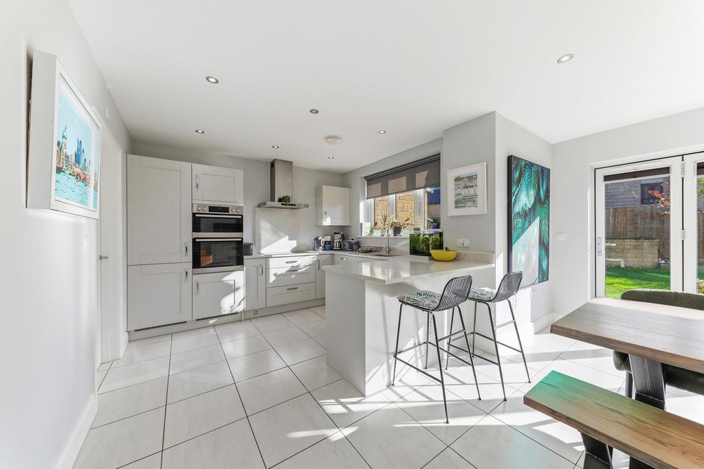 From the moment you step inside, the sense of space and quality is clear. The open-plan kitchen and dining room, complete with breakfast bar and high-end finishes, forms the heart of the home — ideal for relaxed family living or entertaining guests. Large bi-folding doors open out to a beautifully landscaped private garden, where multiple seating areas, a pergola, and an outdoor kitchen create the perfect backdrop for long summer evenings.