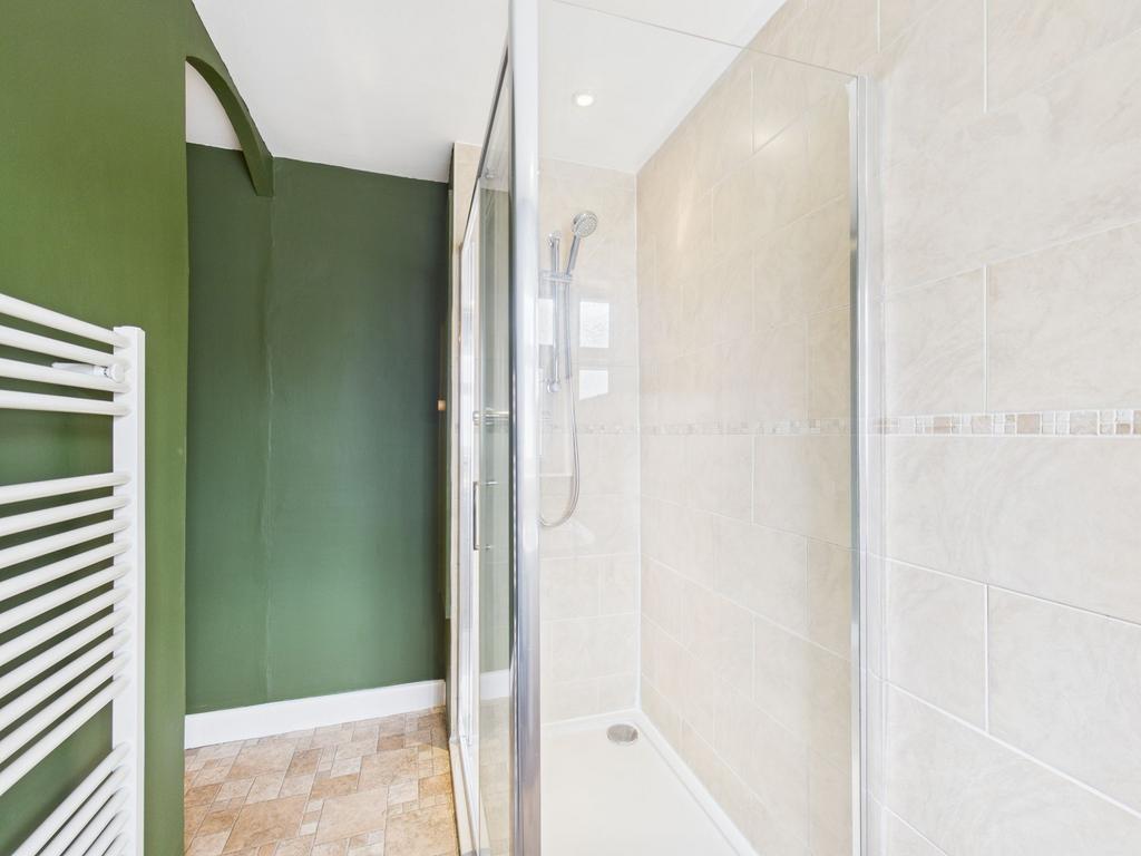 First floor: Large principal bedroom with FITTED WARDROBES, second single bedroom and house SHOWER ROOM with large WALK IN SHOWER and white suite.