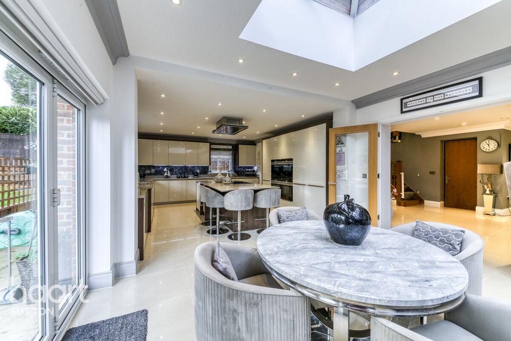 The property features five spacious bedrooms and three stylish bathrooms, providing ample room for family and guests. The versatile layout includes four reception rooms, offering flexible spaces for entertaining, relaxing or working from home. At its heart is a stunning open-plan kitchen and family dining area spanning the full width of the house, overlooking the landscaped gardens, perfect for both everyday living and special occasions.