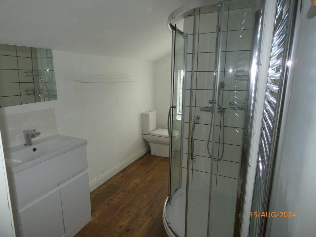 The modern shower room has a fully tiled corner shower cubicle with a chrome bar shower with both rain shower and adjustable heads. There is a modern sink unit with a built in storage cupboard beneath and a low level WC. With ceramic tiled flooring, opaque glazed window to the rear elevation, a chrome ladder style radiator and built in cupboard with a wall mounted Worcester boiler.