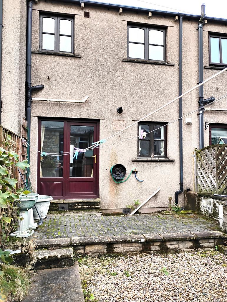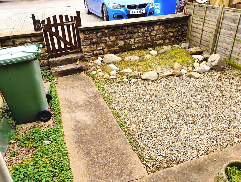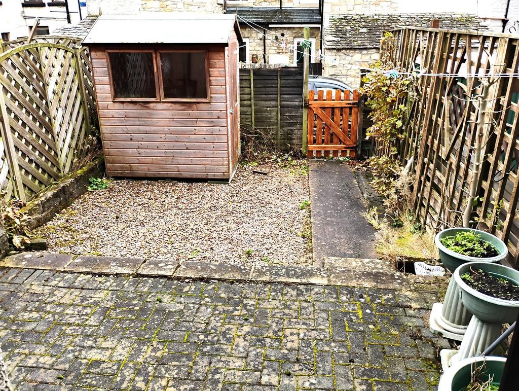 Enclosed patio garden area with shed and access gate onto pedestrian pathway to the rear of the terrace.