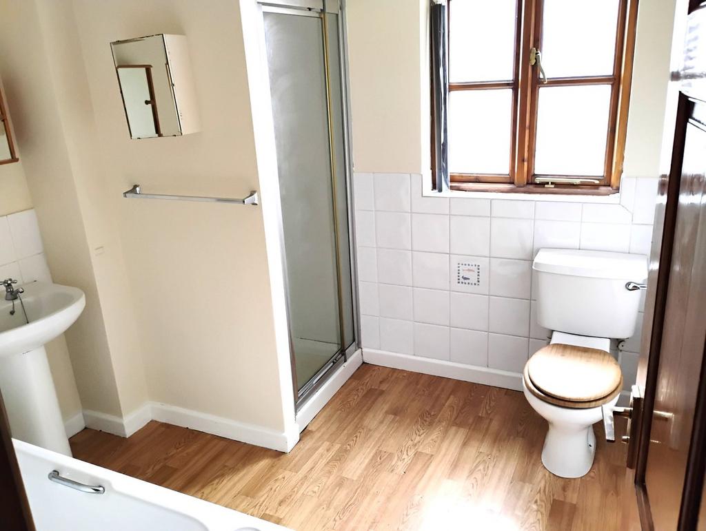Four piece bath suite comprising panelled bath, low flush WC, pedestal wash basin and shower cubicle. Panelled walls, dado rail, extractor vent.