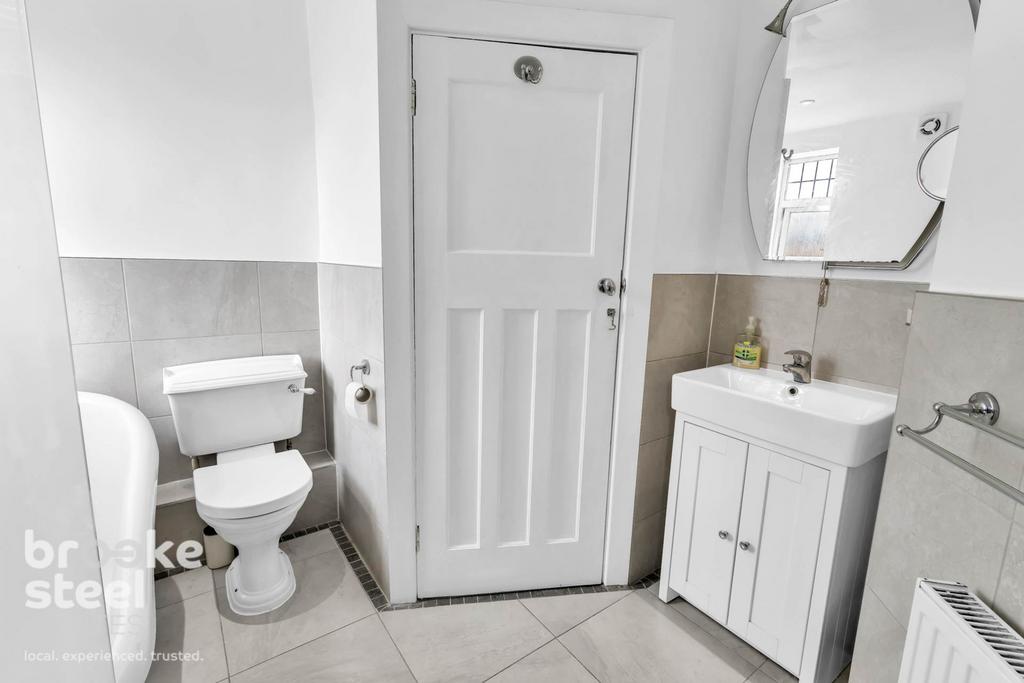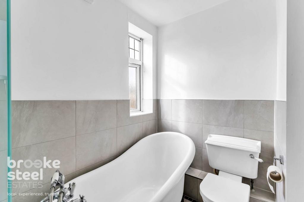 Fitted with stylish white four piece suite. Roll top bath, walk in shower, wash hand basin and low level WC. Tiled flooring and part tiled walls.