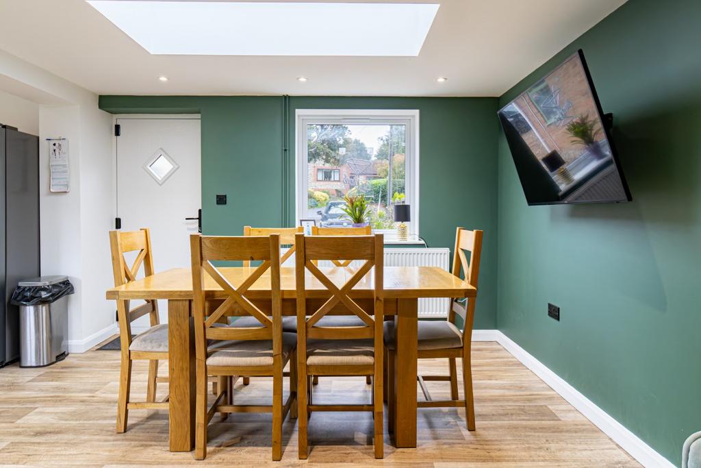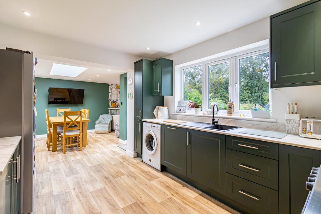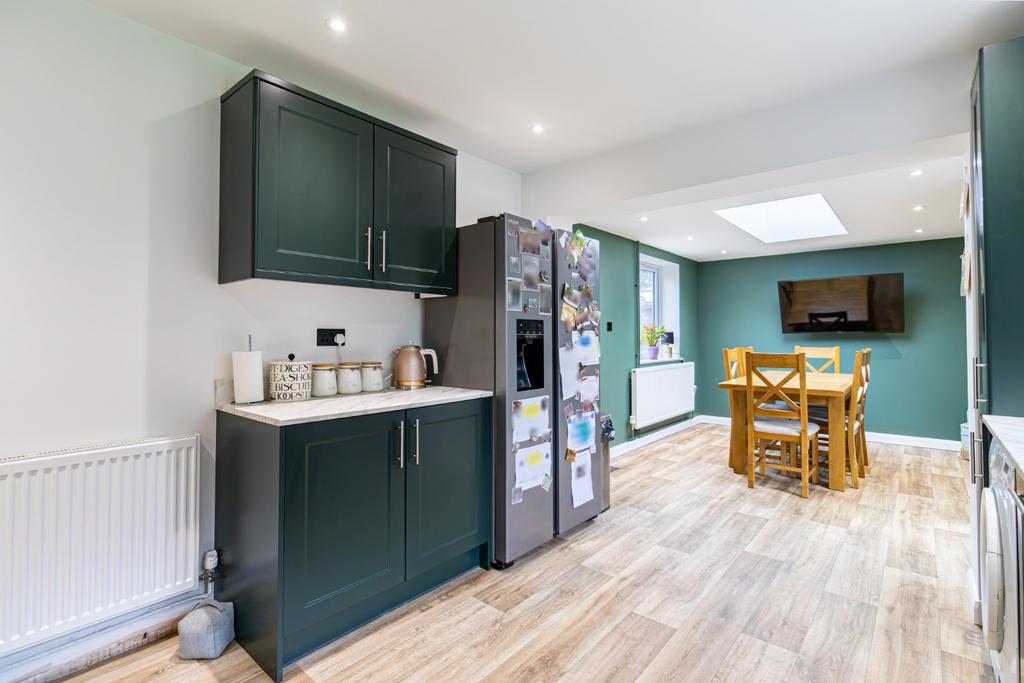 Upon entering the property, visitors are welcomed into a small entrance hall, ideal for storing coats and shoes before stepping into the main living areas. The first room you encounter is the wonderful dual-aspect living room, a bright and comfortable space enhanced by a charming log burner that adds warmth and character. Positioned at the rear of the home is the impressive open-plan kitchen/diner, a well-lit and spacious area designed with modern living in mind. A large roof lantern and dual-aspect windows to the front and rear flood the space with natural light, making it a superb setting for both everyday living and entertaining. The kitchen is fitted with a stylish range of contemporary shaker-style units, attractive worktops, an integrated dishwasher, and space for all essential appliances. The adjoining dining area is perfect for hosting and also features a casual seating space, currently used by the owners as a bar area, ideal for relaxed socialising. Three comfortable bedrooms are arranged around a central hallway, all of which are served by a stylishly appointed family bathroom. The bathroom comprises a P-shaped bath with overhead shower, a wash basin vanity unit, and a WC.