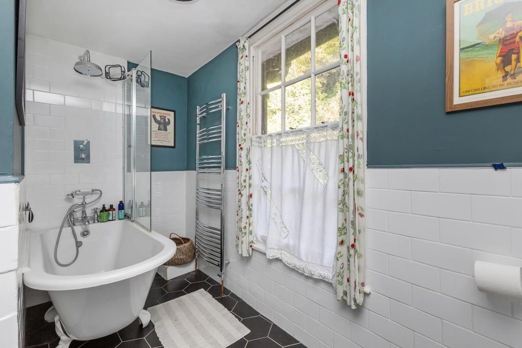 On the first floor is a double bedroom with views across Lewes rooftops and the bathroom features a Victorian style suite with a free standing 'Ball and Claw' bath with oversized shower head over, This space offers a retreat for unwinding, combining classic design with modern comfort. Then on the second floor is the other double bedroom with even better views to the Downs and Lewes Castle.