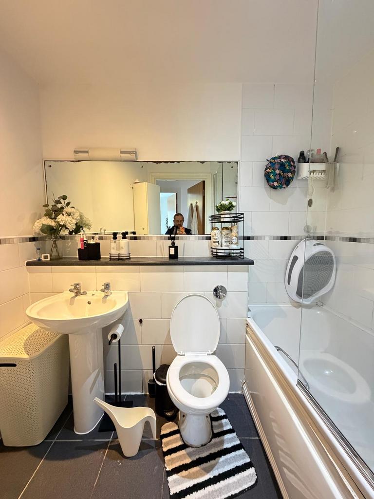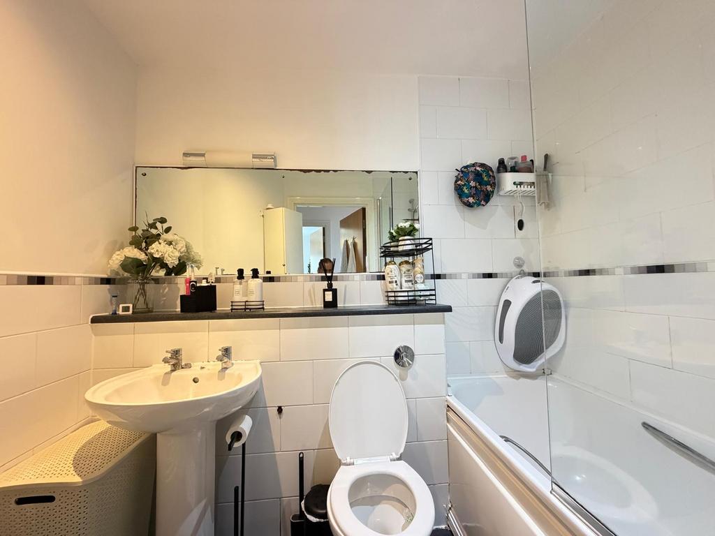 A contemporary bathroom complete with a shower over the bath, WC and wash basin ( 2.3m x 1.7m)