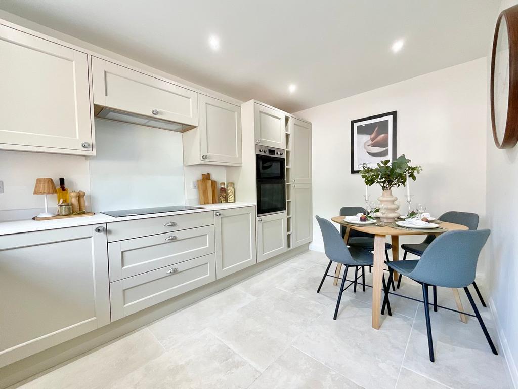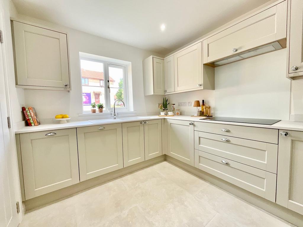 Opening onto a spacious hall with large cloaks cupboard housing the under floor heating system, the tiled floor extends into the downstairs cloakroom with close coupled w/c and pedestal basin. Fully fitted the kitchen features integral appliances including dishwasher, fridge/freezer, double oven, 4 ring hob with extractor over. The lounge has French doors to the garden and under stairs storage cupboard.