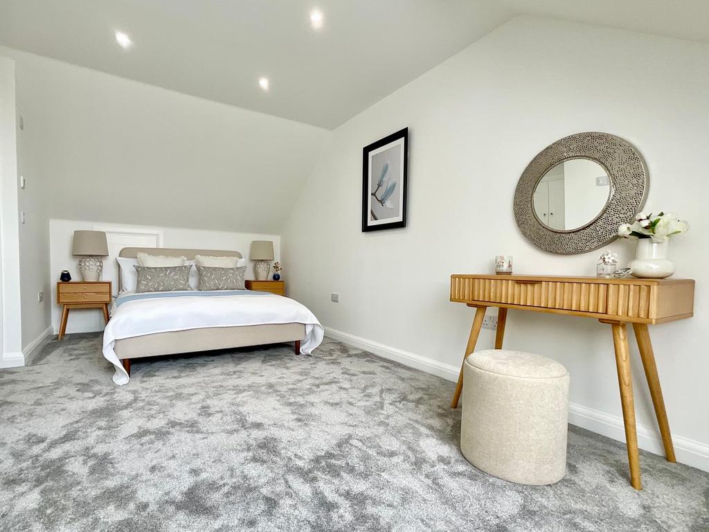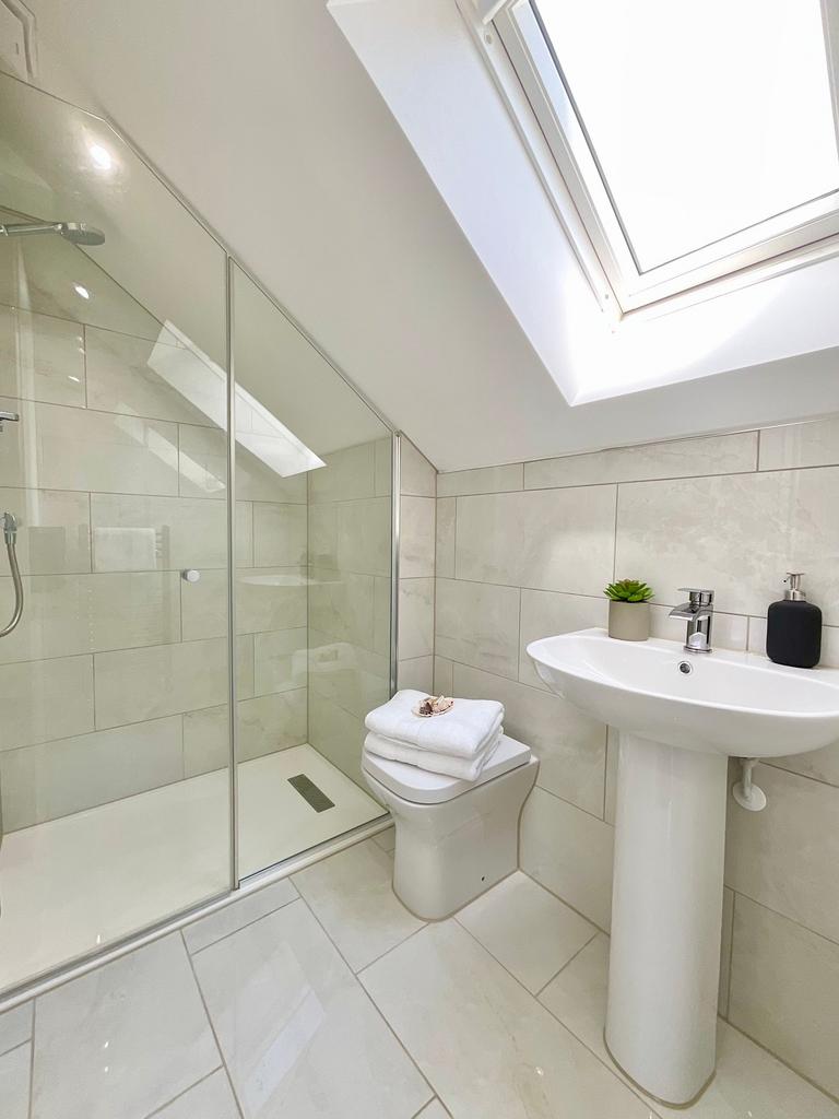 On the second floor is a large ensuite room with eaves storage, over stairs cupboard and a walk in recess ideal for storage or desk space. Part tiled the ensuite shower room features Velux window, close coupled w/c, pedestal sink, shower and heated towel rail.