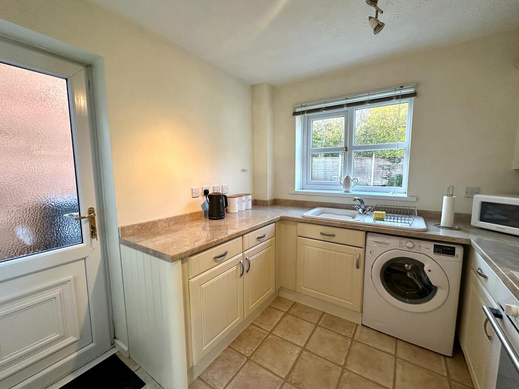 Kitchen with wall and base units, work surface, sink and drainer, 4 ring electric hob, integrated oven/grill, space for washing machine, space for fridge/freezer, plenty of storage space, double glazed window to the rear of the property and tiled flooring.