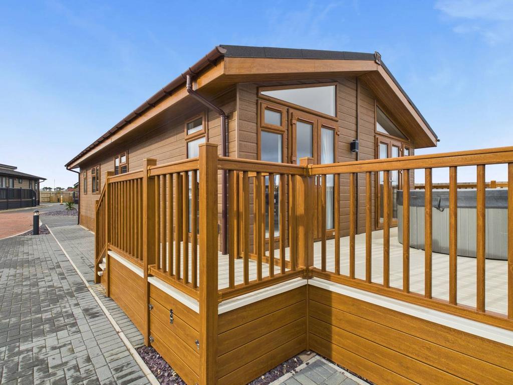 The Stately Albion Warwick Executive at Sandy Beach Holiday Park, Bacton, Norfolk offers an elevated lodge experience with premium features throughout. Perfectly positioned right on the beach with stunning sea views, this spacious lodge is designed for both comfort and style. The thoughtfully planned kitchen features a Velux window for abundant natural light, upgraded cabinets with elegant glass feature shelves, and an integrated wine cooler. The open-plan living area showcases a fully vaulted ceiling with a dramatic glass front elevation, creating a light-filled and airy environment. Externally, a beautifully crafted gable adds to the lodge’s charm and overall “wow” factor.