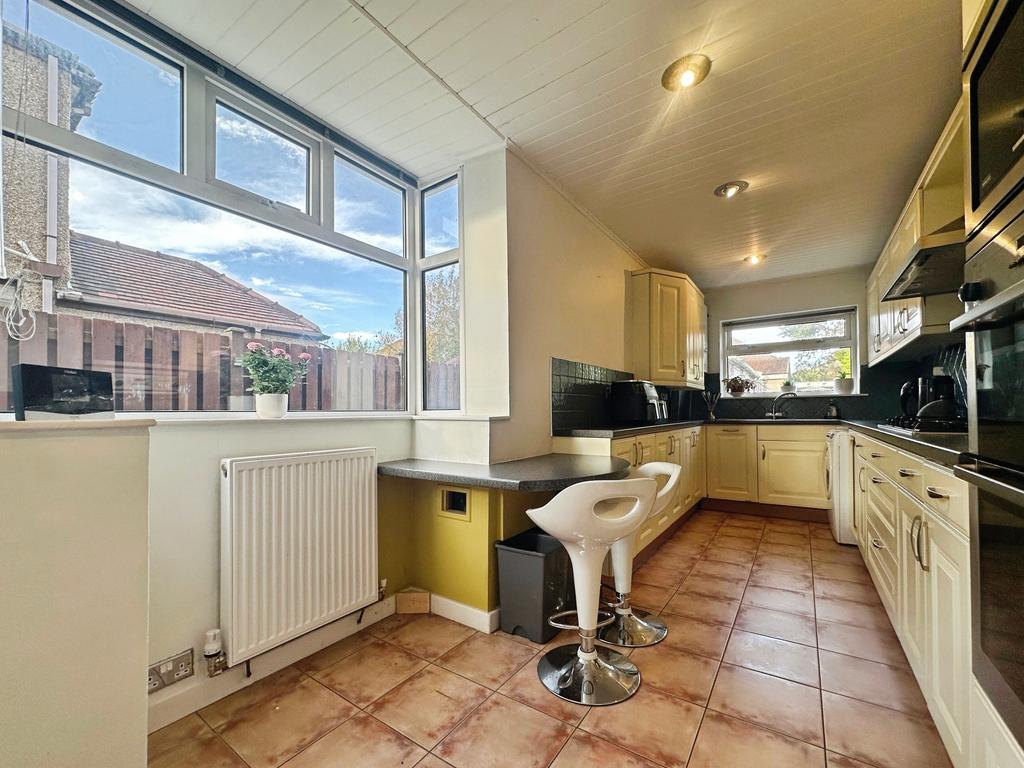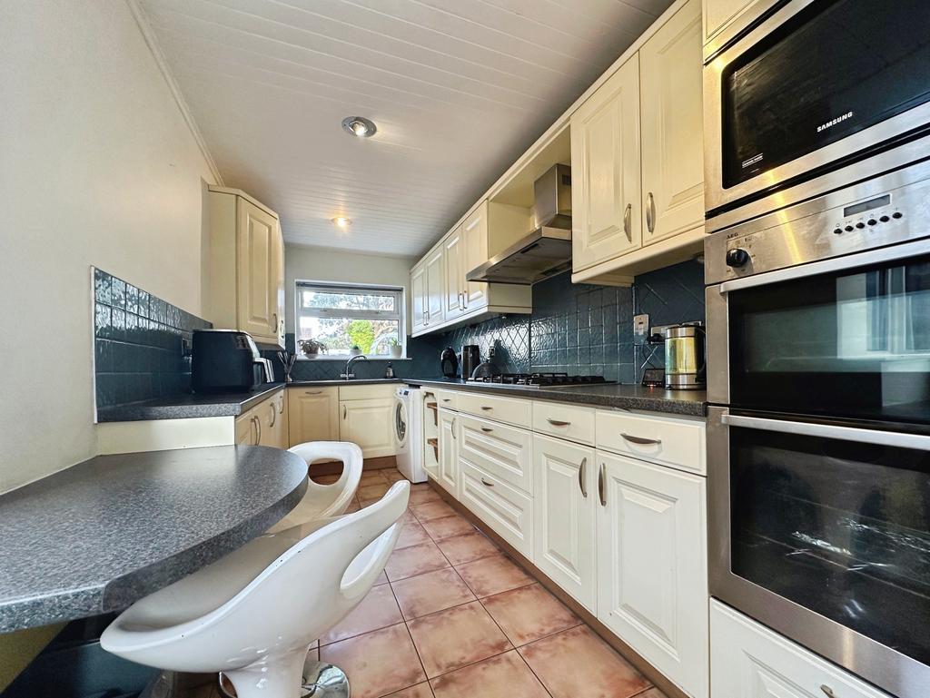 uPVC double glazed bay window to the side elevation and a further panel to the rear . uPVC side door allowing access to the garden. Central heating radiator. Fitted kitchen with black laminated working surfaces accommodated with Wooden cupboard doors. Oven, grill and four ring gas hob. Stainless steel sink with drainer. Space for a washing machine and tower fridge freezer. Partial tiling. Power points. Spot lights.