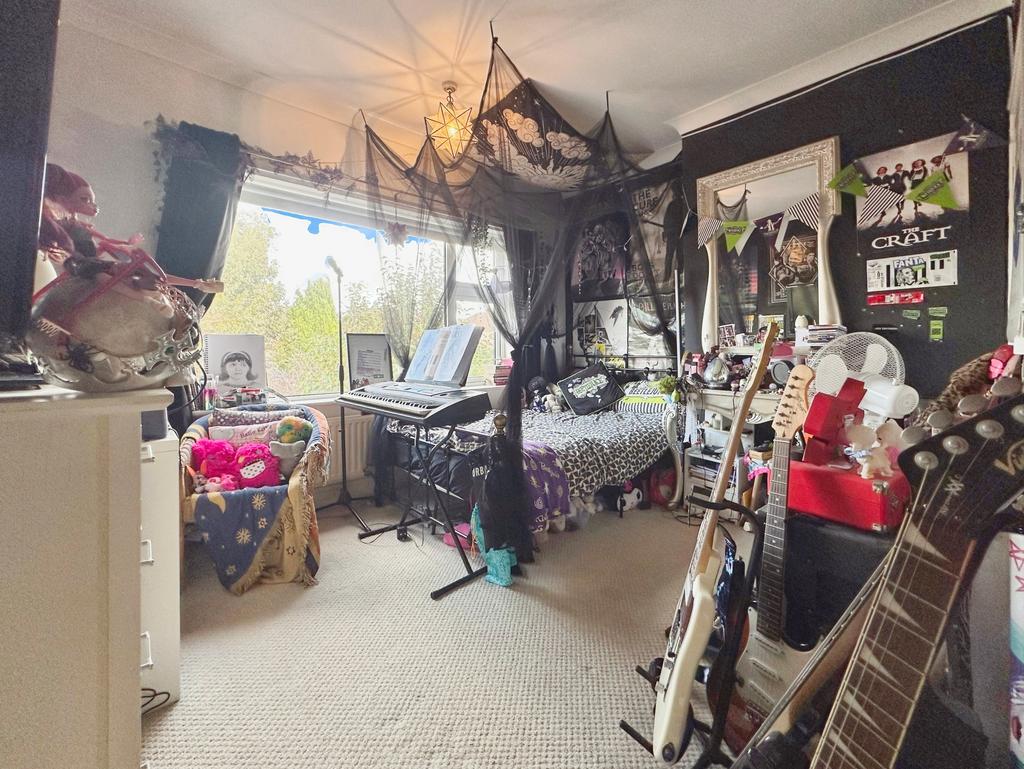 Circular uPVC double glazed bay window to the front elevation. Central heating radiator. Double bedroom with fitted wardrobe space. Carpet. Power points. Ceiling light point.