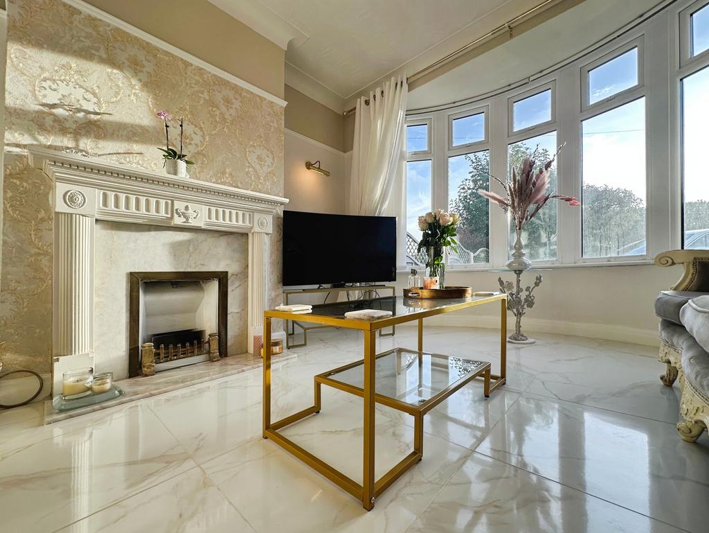 Circular uPVC double glazed bay window to the front elevation. Central heating radiator. Bio-ethanol fire with feature surround. and tiled back. Television point. Tiled flooring. Original coving. Power points. Two wall light points. Ceiling light point.