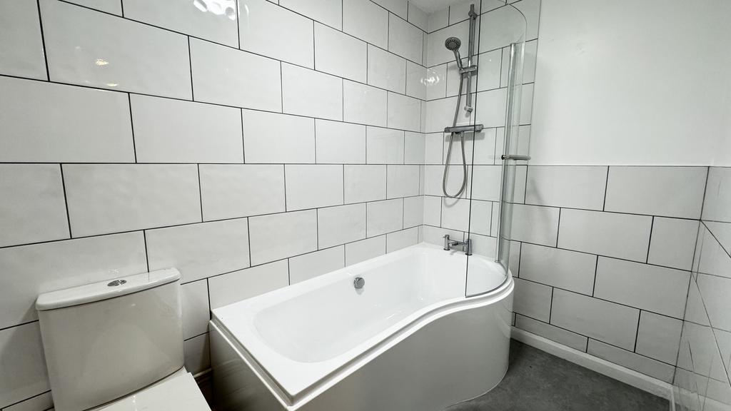 Brank new bathroom suite with P shaped bath and mixer tap, thermostatic shower mixer, part tiled walls, low level WC, pedestal wash basin with mirror and shaver/light over, chrome heated ladder style towel rail, new vinyl flooring.