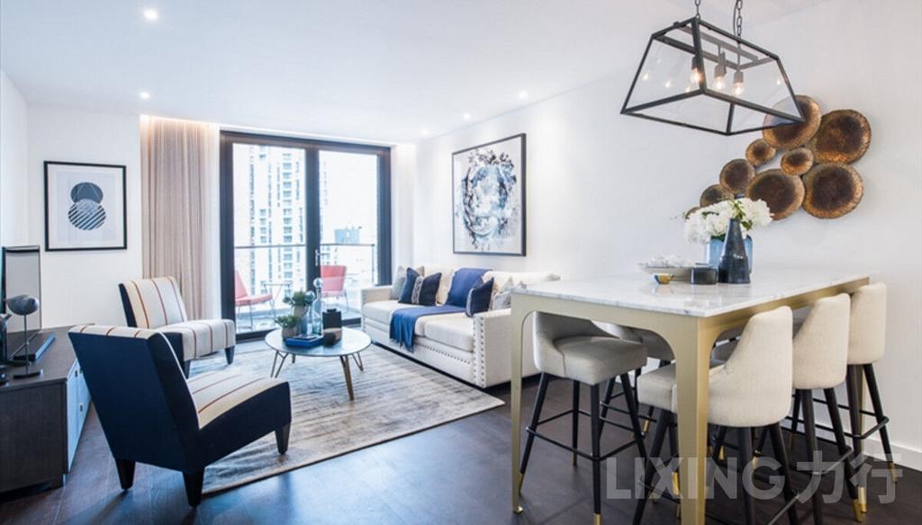 The apartment comprises a spacious reception room complete with Samsung Smart TV's with Bose sound bars incorporating a built in Amazon Alexa to control the apartments lighting, TV and heating systems along with a private balcony. The reception room is open plan with a fully fitted kitchen featuring integrated AEG appliances with floor to ceiling windows providing far reaching views across London. The apartment offers a master bedroom suite with walk-in wardrobes, an en-suite bathroom featuring a custom designed mirrored unit with integrated demisting features as well as a private balcony from the bedroom. The apartment benefits from two further double-bedrooms and a family shower room. The apartment also benefits from ample storage space.
