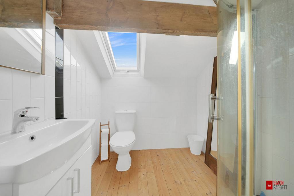 Accessed from the landing via a sliding timber door, the shower room has a corner shower, WC, basin with integral vanity unit, wall mounted mirror and a mixer tap. There is spotlight light fitting and Velux window proving ample light to the space.