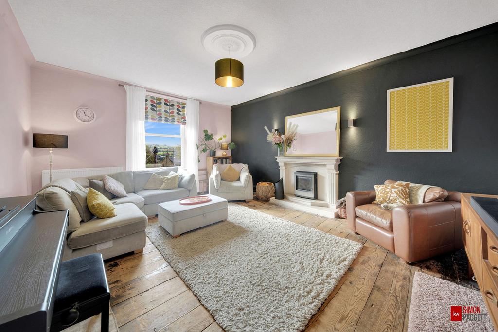 A bright and spacious room with solid timber flooring centered around a beautiful fireplace with a marble surround and inset multi-fuel stove, creating a cosy atmosphere during the colder months. The large UPVC sash window provides lovely countryside views, complemented by a radiator and a central light fitting, housed within an ornate ceiling rose.