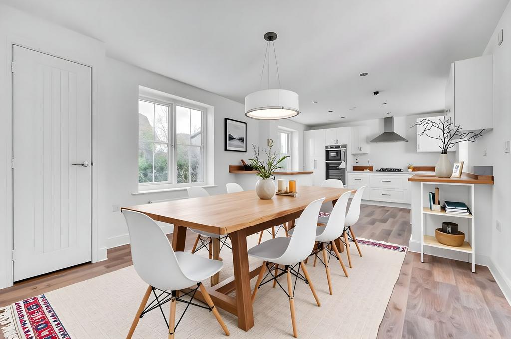 A dual-aspect lounge, also with French doors to the garden, provides a spacious and welcoming place to relax, while the separate dining room offers versatility, ideal as a formal dining space, home office, playroom, or TV room.