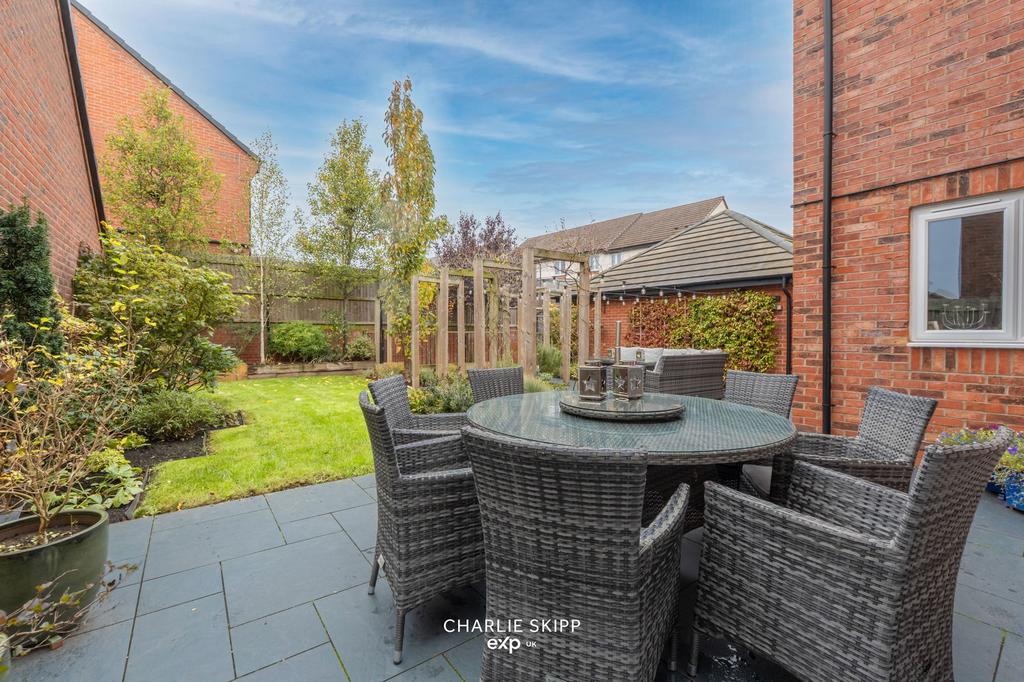 The rear garden has been thoughtfully designed for modern outdoor living. A private haven with sun-drenched patio areas, an inviting walkway, and ample space for alfresco dining. A gated path leads to a private driveway and external garage, ensuring both security and ease of access.