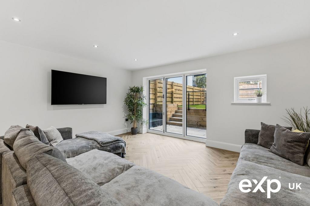 A vast, free-flowing, modern living/dining kitchen, this seamless open-plan space will be fitted with the buyer's choice of kitchen from the sellers' range. Please refer to the images that illustrate a recommended design of a modern, usable, high-end kitchen with ample storage solutions and a fabulous oversized central island seating area. The kitchen will include quality branded integrated appliances, luxury tiled flooring with practical underfloor heating and warmly lit downlighting. The dining area provides a spacious setting for a big dining table and chairs for family get-togethers and celebrations, and there is also more than enough room here for relaxed seating in front of showstopping bi-folding doors that will open out to the patio and frame the rear garden together with a uPVC window to the rear.