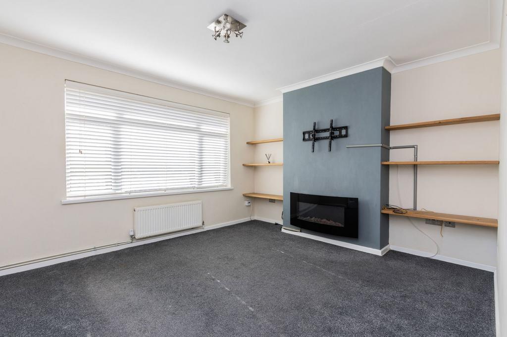 The sitting room is bright and well-proportioned, featuring a wall-mounted electric fire and oak shelving, offering a comfortable and thoughtfully designed living space. The adjoining kitchen is fitted with a range of cupboards and integrated appliances, and enjoys a pleasant rear aspect with views towards the town centre.
