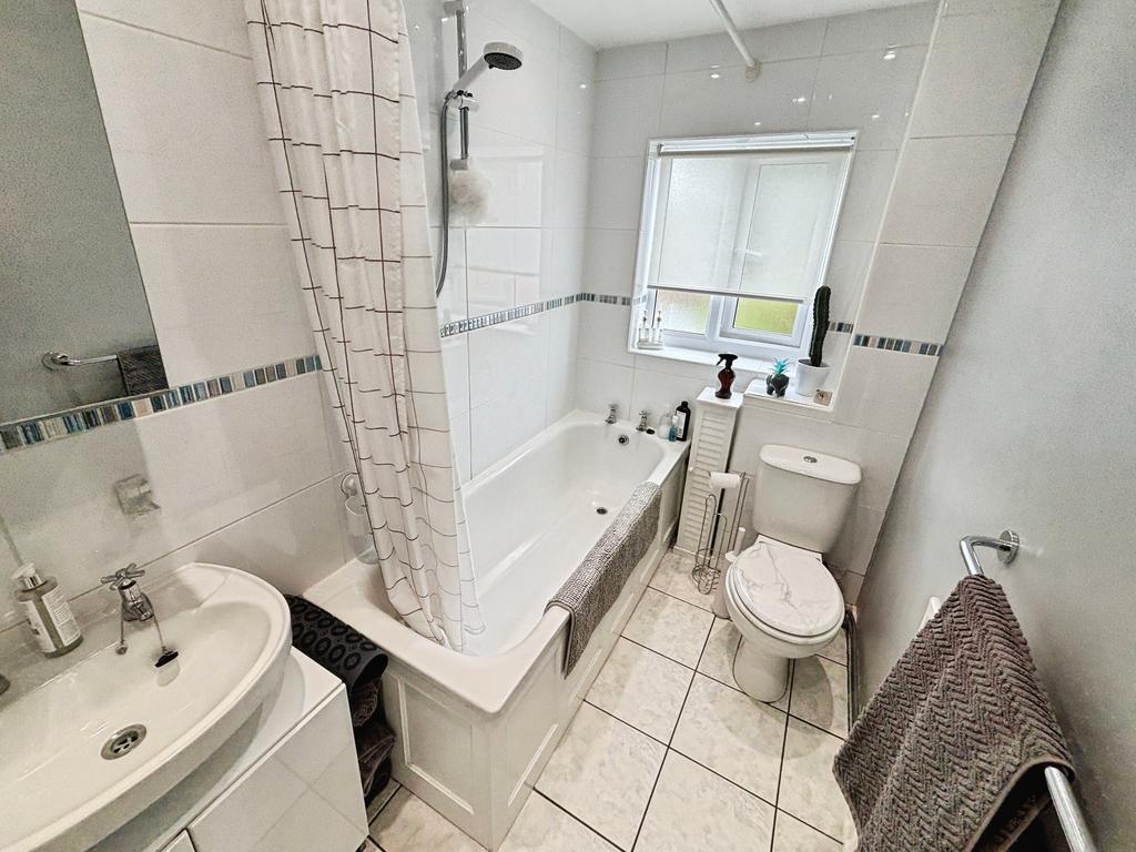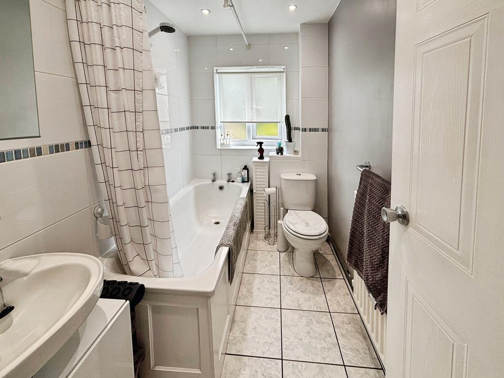 The family bathroom is tastefully finished with an overhead shower, creating a perfect space to unwind after a long day.