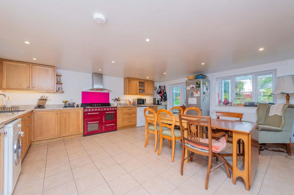The kitchen itself is a testament to modern country elegance, having been upgraded with a bespoke Shepherd's Hills solid oak kitchen, featuring soft-close cupboards and luxurious granite worksurfaces. Culinary enthusiasts will appreciate the high-spec appliances, including a SMEG range cooker with two electric ovens, a grill, and an induction hob, alongside a dedicated wine cooler. Adjacent to the kitchen, a bright sun room provides the perfect spot to enjoy your morning coffee while taking in the glorious front garden and surrounding vistas.