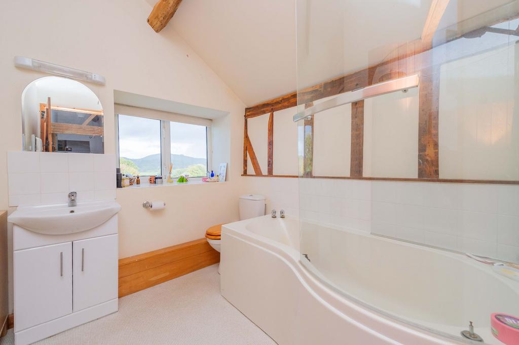 Ascending the original wooden staircase, the first-floor landing impresses with its exposed beams, vaulted ceiling, and handy eaves storage. The master bedroom is a generous principal suite, benefiting from dual-aspect windows and a private shower ensuite. The remaining three bedrooms include a spacious double room with a built-in wardrobe and exposed beams, along with two cosy single rooms, all featuring fitted carpet. The family bathroom offers a panelled bath with a shower over, a WC, and vanity sink with storage, but its most striking feature is the window that frames truly spectacular, far-reaching views over the unspoilt countryside, making every bath a moment of peaceful contemplation.