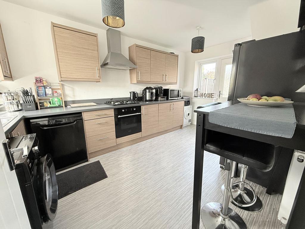 With a range of matching wall mounted cupboards and base unites, with a roll top work surface over, incorporating a stainless steel sink with drainer, with mixer taps over, a gas hob, with an electric oven under, a wall mounted stainless steel extractor hood over, with a stainless steel splash back, space and plumbing for a washing machine, space for a dryer, space for an fridge freezer, complimentary splash back tiling, a useful storage cupboard off, housing a modern combination gas central heating boiler, laminate flooring, a rear door leading to garden, dual aspect UPVC windows front and rear, and two ceiling light points.