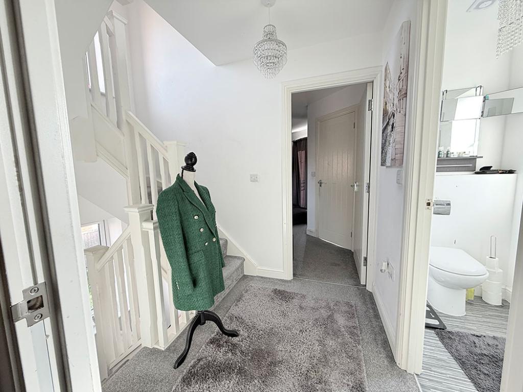 With a low level modern flush W.C., a wall mounted wash hand basin inset into a vanity unit, with complimentary splash back tiling, a wall mounted single panel radiator, a UPV frosted window to front elevation, vinyl flooring, an extractor fan and ceiling light point.