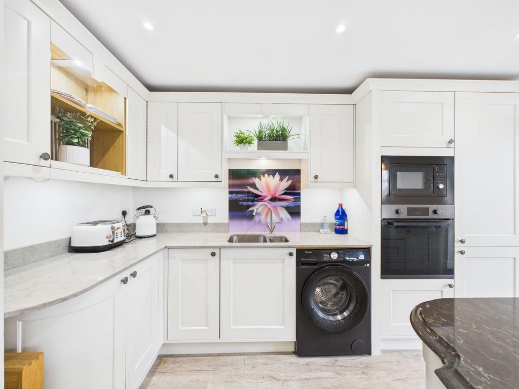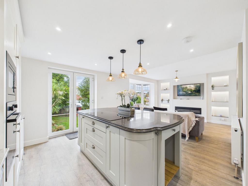 KITCHEN AREA Matching wall, base and drawer units, granite worksurfaces with splashback, separate island with granite worksurface and built in cupboards below, over hanging breakfast bar area, wine cooler, five ring induction hob, glass display units, eye level oven with built in microwave combi, inset 11/2 bowl stainless steel sink unit with mixer tap over, high gloss feature splashback with shelving above, power points, shelving units, storage cupboard, integral fridge freezer and laminate flooring.