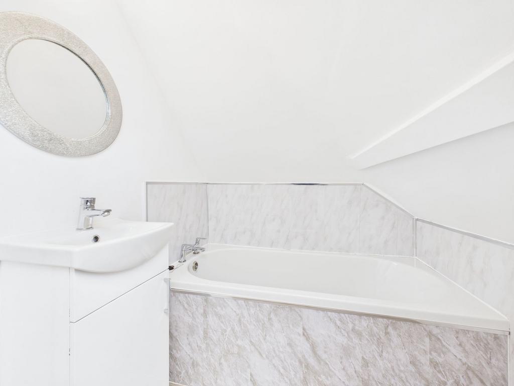 EN-SUITE Rear aspect Velux window, panel enclosed bath with mixer tap over, vanity wash hand basin, low level WC, modern chrome towel rail and extractor.