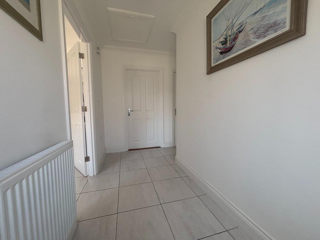 L-shaped and with tiled flooring, access to loft and door to generous storage cupboard with built-in shelving and cloak hanging space. Doors to: