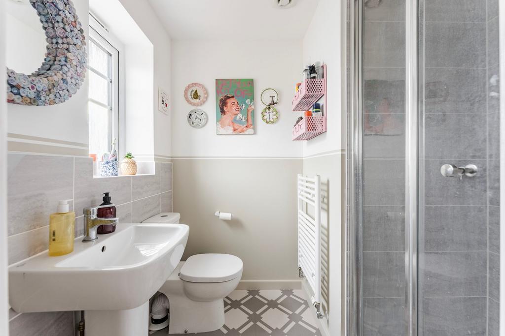 Upstairs, the master bedroom benefits from built-in wardrobes, an over-stairs storage cupboard, and a private en-suite shower room. Two further bedrooms offer versatile accommodation, while the modern family bathroom features a bath with shower over, part-tiled walls, heated towel rail, and LVT flooring.